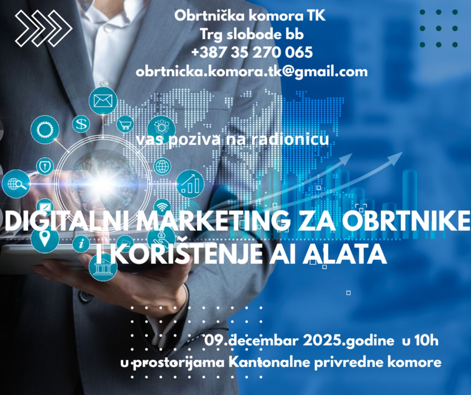 Zadovoljstvo nam je pozvati Vas na radionicu „Digitalni marketing za obrtnike i korištenje AI alata“ koji se organizuje u finansijsku podršku Vlade Federacije Bosne i Hercegovine i Federalnog ministarstva razvoja poduzetništva i obrta okviru projekta Programa utroška sredstava Tekućih transfera neprofitnim organizacijama – Projekat „Poticaj komorama“ Federalnog ministarstva razvoja poduzetništva i obrta, koji se implementira od strane Obrtničke komore Federacije Bosne i Hercegovine i Obrtničke komore Tuzlanskog kantona.