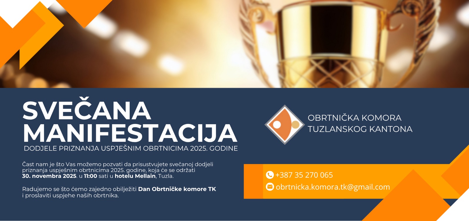 Obrtnička komora Tuzlanskog kantona sa ponosom vas poziva na svečanu manifestaciju dodjele priznanja uspješnim obrtnicima 2025. godine. Manifestacija se održava 30.novembra 2025. godine u hotelu Mellain u Tuzli sa početkom u 11:00 sati. Ovaj događaj ima za cilj da okupi obrtnike, institucije i širu poslovnu zajednicu te da kroz dodjelu priznanja i nagrada istakne doprinos […]